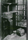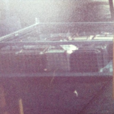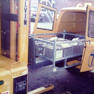 | A poor quality photo (taken by the author) of a cage of full cash containers being returned to the Post Office accounts team |