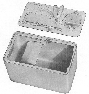 | The cash container would be slid into the cash compartment of the payphone, where a permanently mounted 'key' would fit into a slot in the top rear of the cash container, thus activating the self sealing mechanism for when the container was removed a few days later. The cash container could sometimes move forwards enough to misalign the money chute with the open slot in the cash container - thus causing money to jam throughout the mechanism above the cash compartment. In these situations (perhaps vibration caused by heavy traffic) I would fit a pair of magnets (an official spare part) inside the rear of the cash compartment - the theory being that the powerful magnets would hold the cash container at the rear of the cash compartment, thus preventing forward movement, |