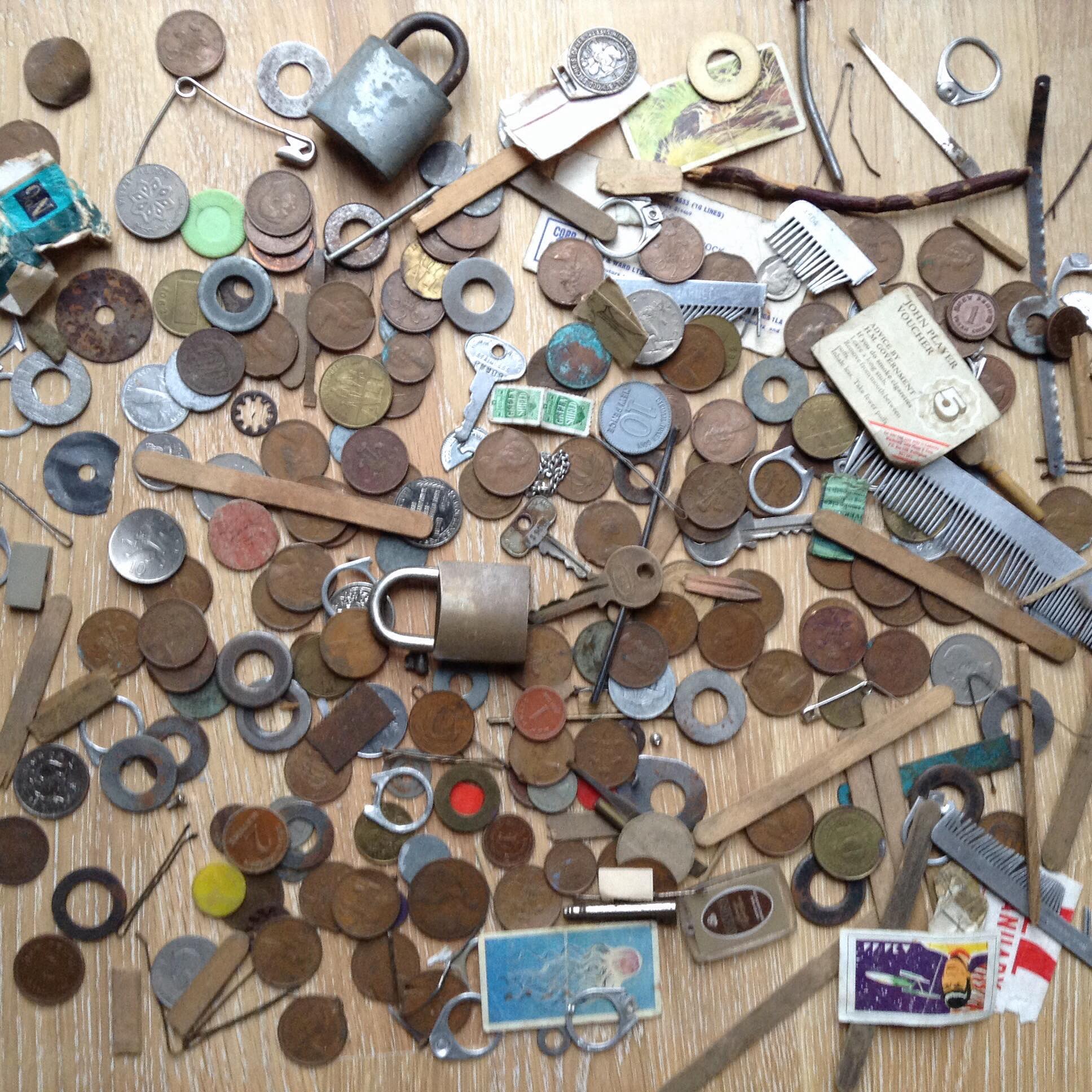 a selection of typical items jamming the mechanism of a public pay on answer telephone (the locks were attached to the handset cable) |