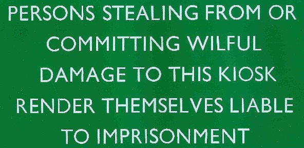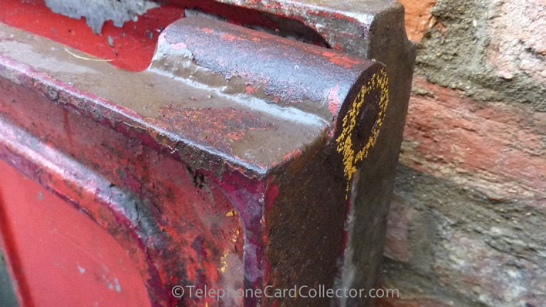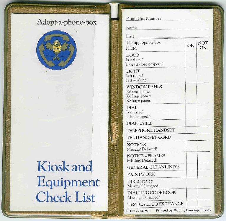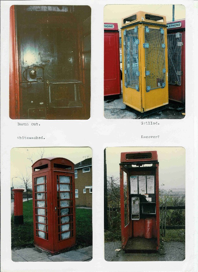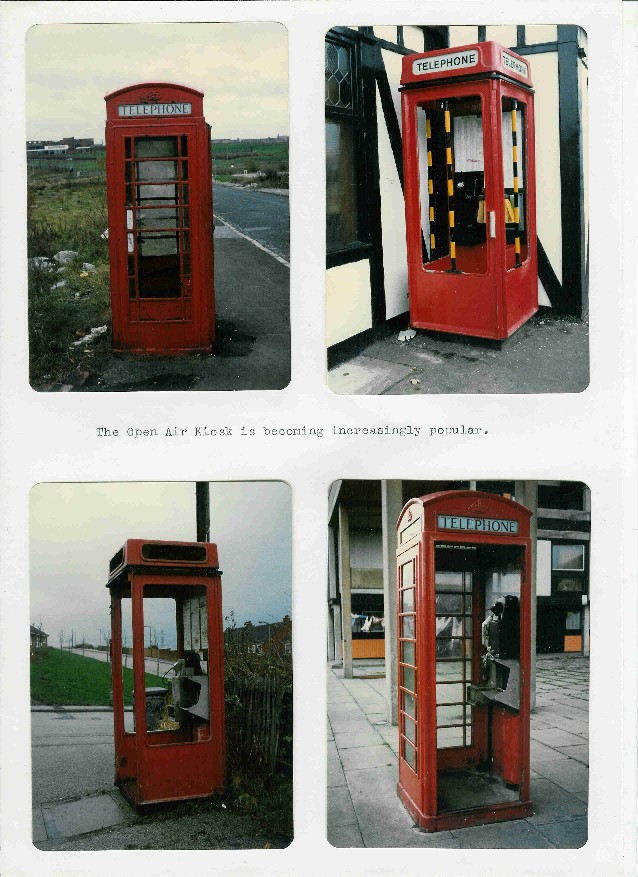 author's original 1982 report Far right: note the K8 with the black and yellow vertical bars; an official K8 part designed to prevent callers leaning against the non existent glass and falling out of the kiosk. No surprises to learn that it was a 'Bar, Safety, 1A'. Photographs copyright Chris Bent |