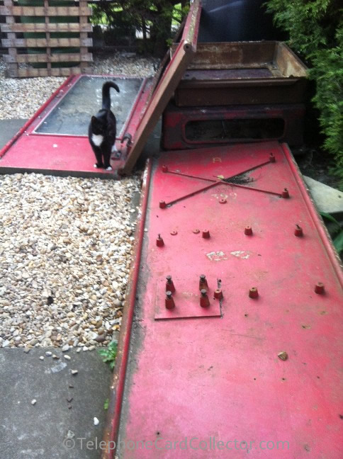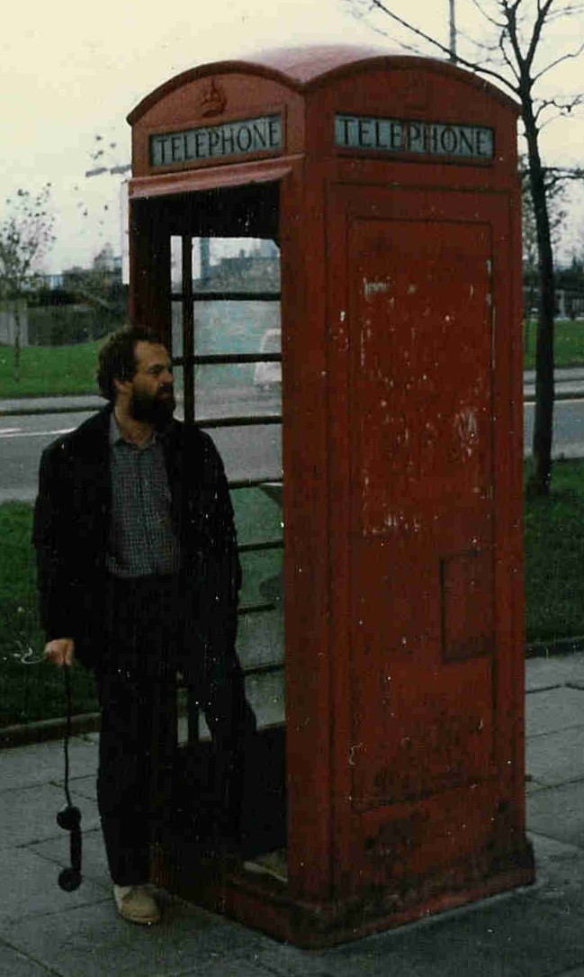 1982: With Handset 11A in hand, the author surveys a vandalised K6. Note the missing door, and the external steel plate providing reinforcement to the rear of the cash compartment |