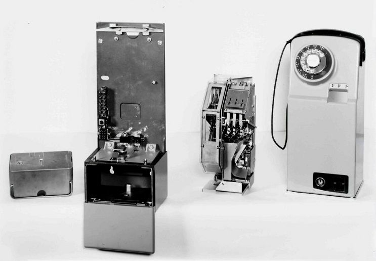 telephone no.705 From left: cash container, cash compartment, mechanism, outer casing |